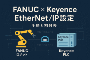 はじめに 工場自動化でロボットは不可欠です。本記事では FANUCロボット と Keyence PLC(KV-8000/KV-7500 など)を EtherNet/IP(※表記ゆれ対策で本文中に「Ethernet/IP」 … 続きを読む 【ロボット制御】FANUCロボット × Keyence PLCでの EtherNet/IP 通信設定
